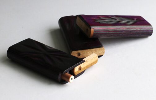 These are handcrafted by the pros in upstate NY. They have been in business for 50+ years. The slider lid is easy to open and reveals the spring loaded pipe slot and the herb compartment. These dugouts can last a lifetime with the right amount of care. The pipes on offer are wood tubes with a brass screw on bowl or the classic ribbed brass pipe.