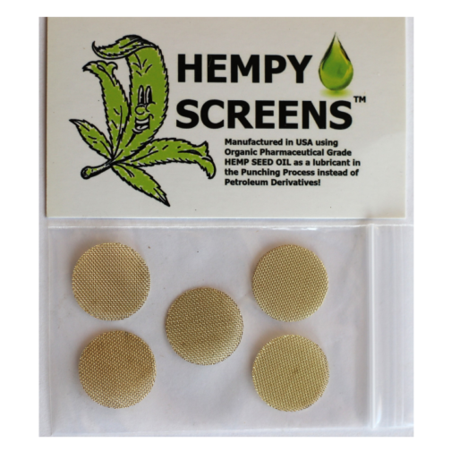 You will receive 5 x brass screens measuring .75″ in diameter. The process to stamp the screen pattern into the brass uses organic hemp oil instead of the standard Petroleum derivatives. These are stiff screens that will fit any pipe with a diameter of .5″ to 1.5″. Most pipe exit holes are smaller than .2″, therefore most screens can wedge into place and reduce ash flow through the pipe stem. We have a wide range of pipes in our shopfront and these screens are the highest quality we offer, based on their stiff flex and hemp production process.
