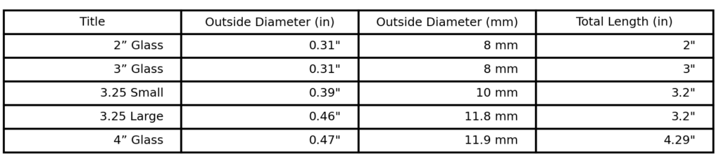 | Glass Length | 2", 3", 3.25"S, 3.25"L, 4" |