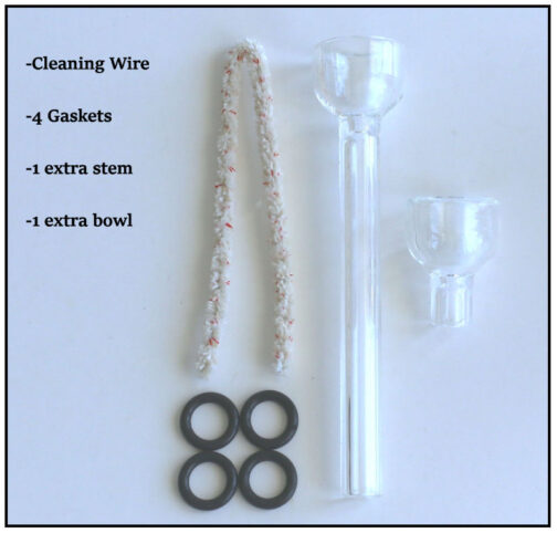 The unit comes in a padded box with extras. You will receive a wire cleaning tool, 4 extra gaskets for the stem, a one piece stem and bowl along with a spare bowl.