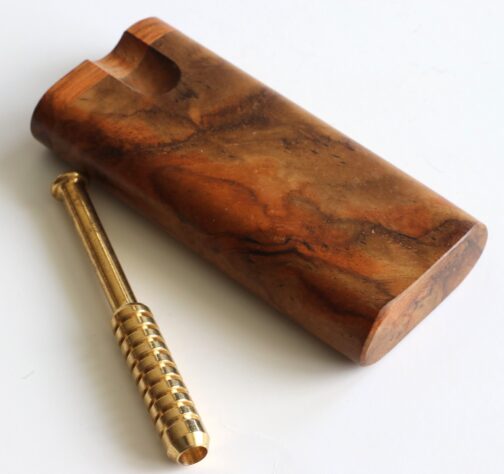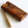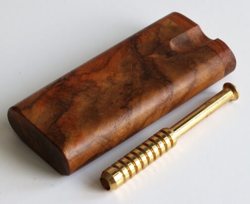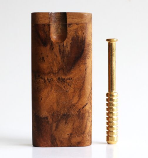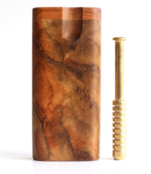 This is a handcrafted Teak Dugout made by the pros at The Mill in upstate NY. 4″ in height, this convenient sleek box will hold herb and a one hitter pipe. Open the Swivel lid to reveal both compartments. These are tried and tested for decades as the go to travel companion for smokers. Included with the teak dugout is 3″ Brass Pipe.